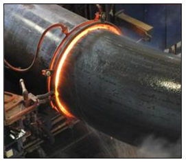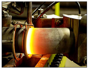 An induction coil is placed around the pipe to be bent. The coil heats a narrow, circumferential zone of pipe to the appropriate bending temperature between 730°C & 1100°C, depending on the pipe material type. When this temperature is reached, the pipe is continuously, gradually moved through the heating ring while a bending moment is applied to the heated area.